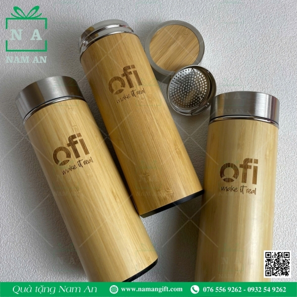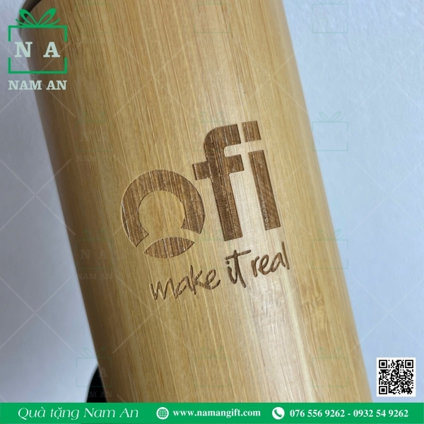 Logo khách hàng Ofi được khắc laser trên bình giữ nhiệt vỏ gỗ