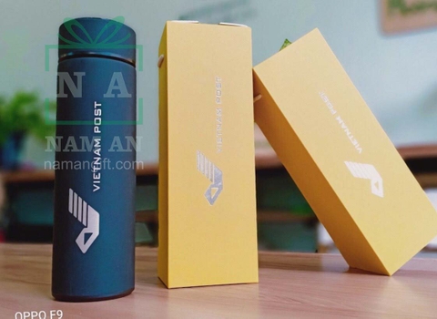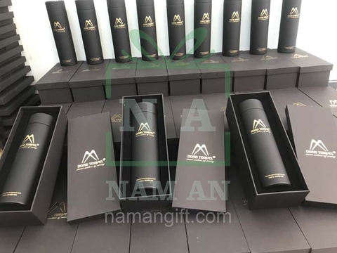 Bên ngoài hộp đựng bình giữ nhiệt được bồi giấy mỹ thuật ép nhũ logo bạn có thể chọn màu giấy hoặc màu nhũ của logo. Bạn cũng có thể in hộp để đựng bình giữ nhiệt theo nhu cầu của công ty.