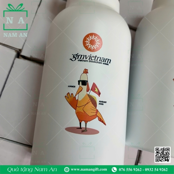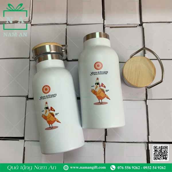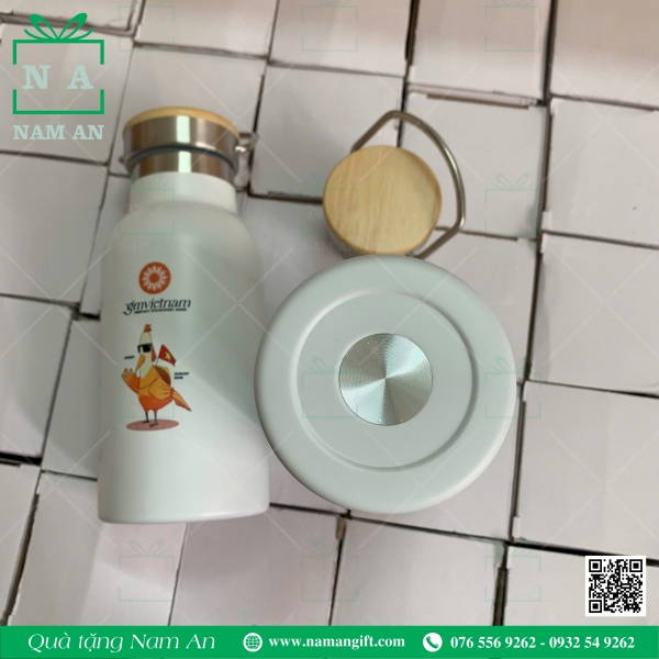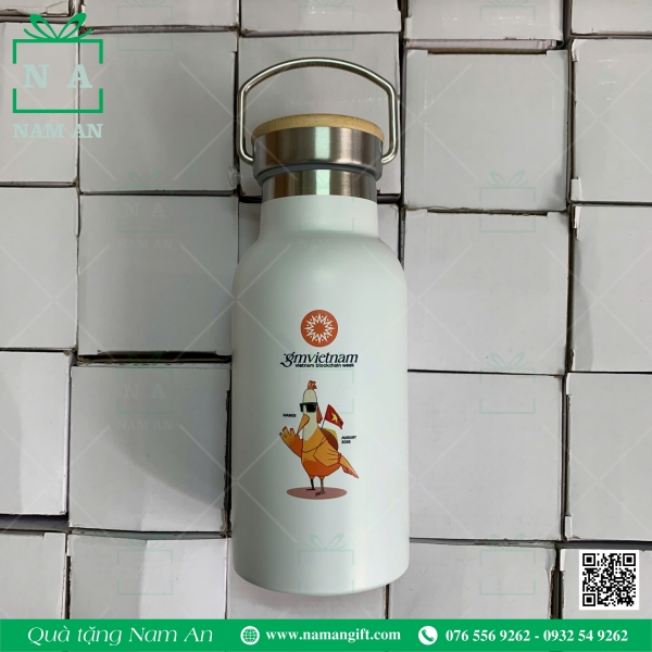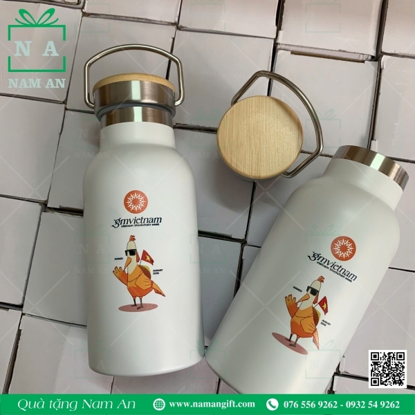 Bình giữ nhiệt nắp gỗ có quai xách in ấn theo yêu cầu cho sự kiện Vietnam Blockchain Week của khách hàng GMVietnam