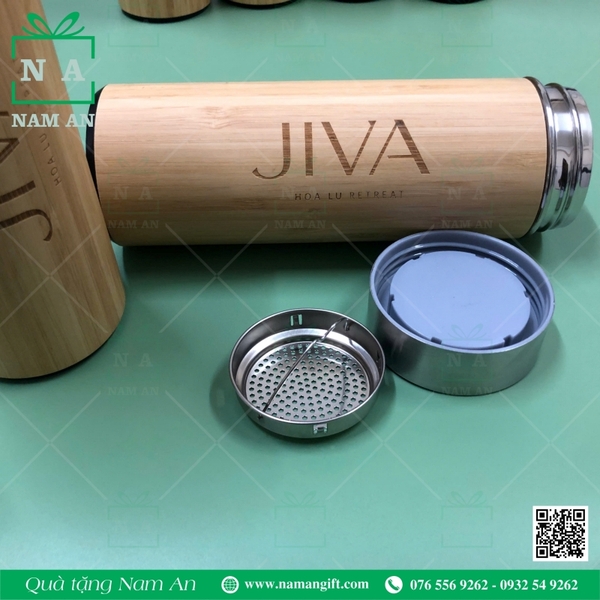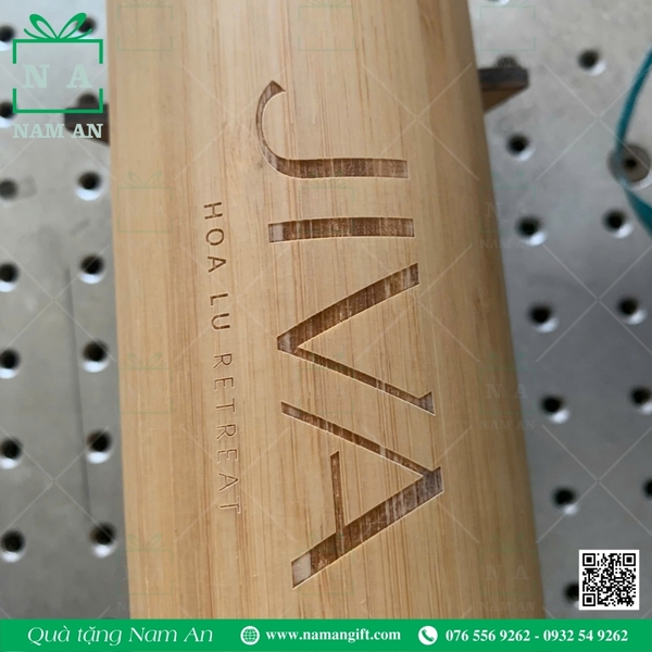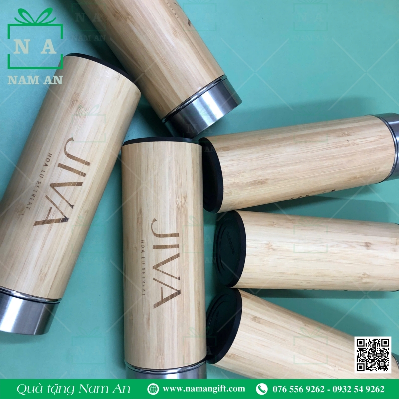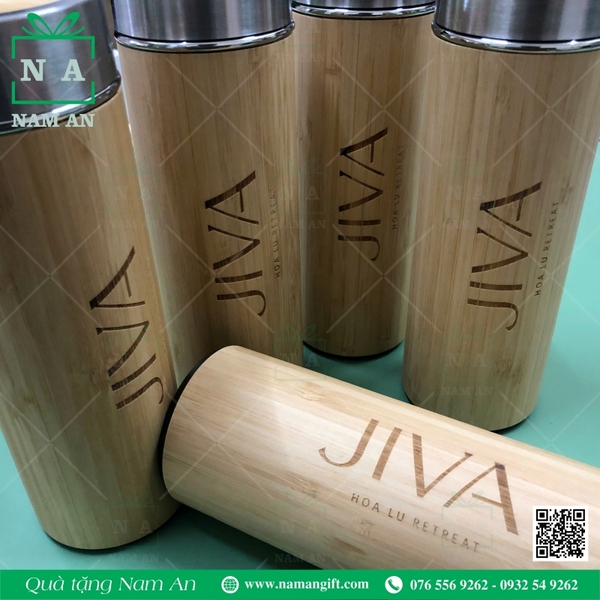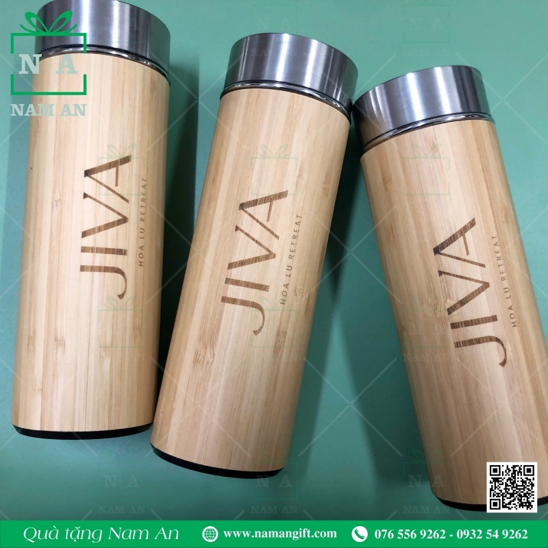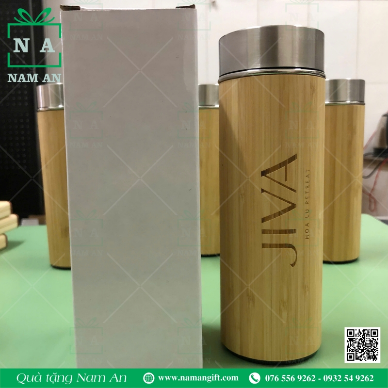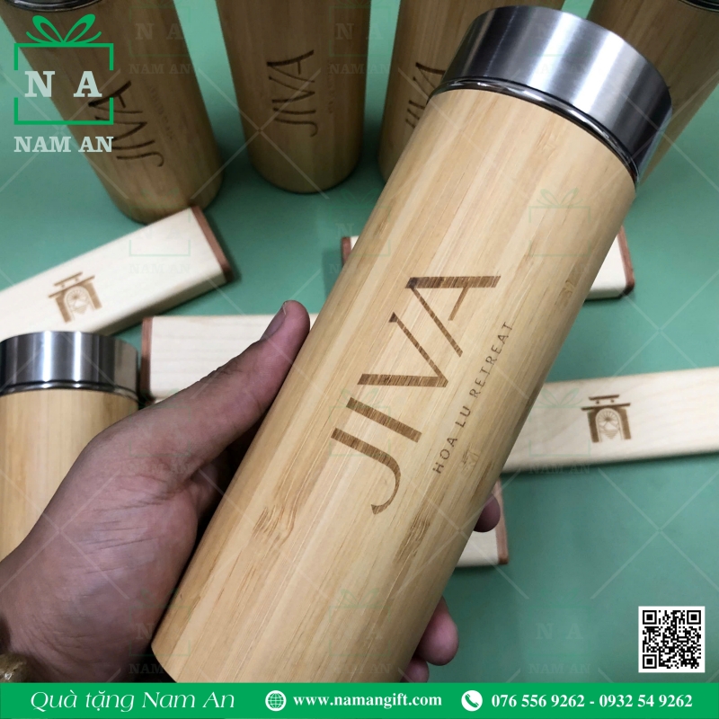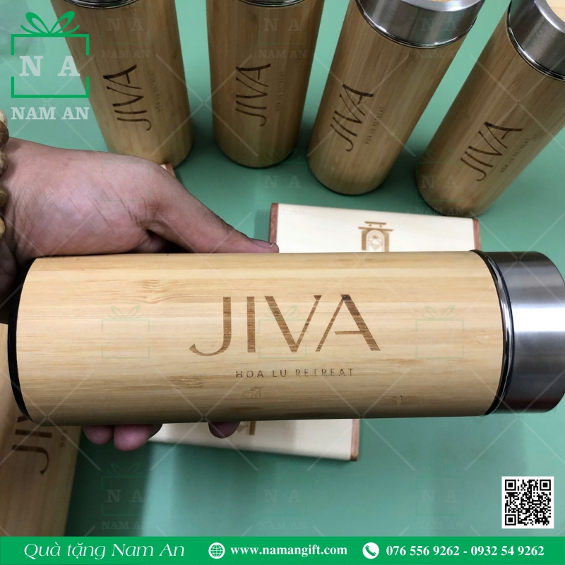 Bình giữ nhiệt vỏ tre khắc máy chuyên dụng logo khách hàng Jiva Hoa Lư Retreat