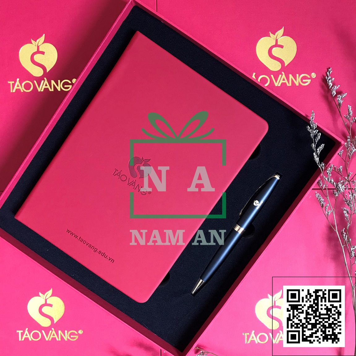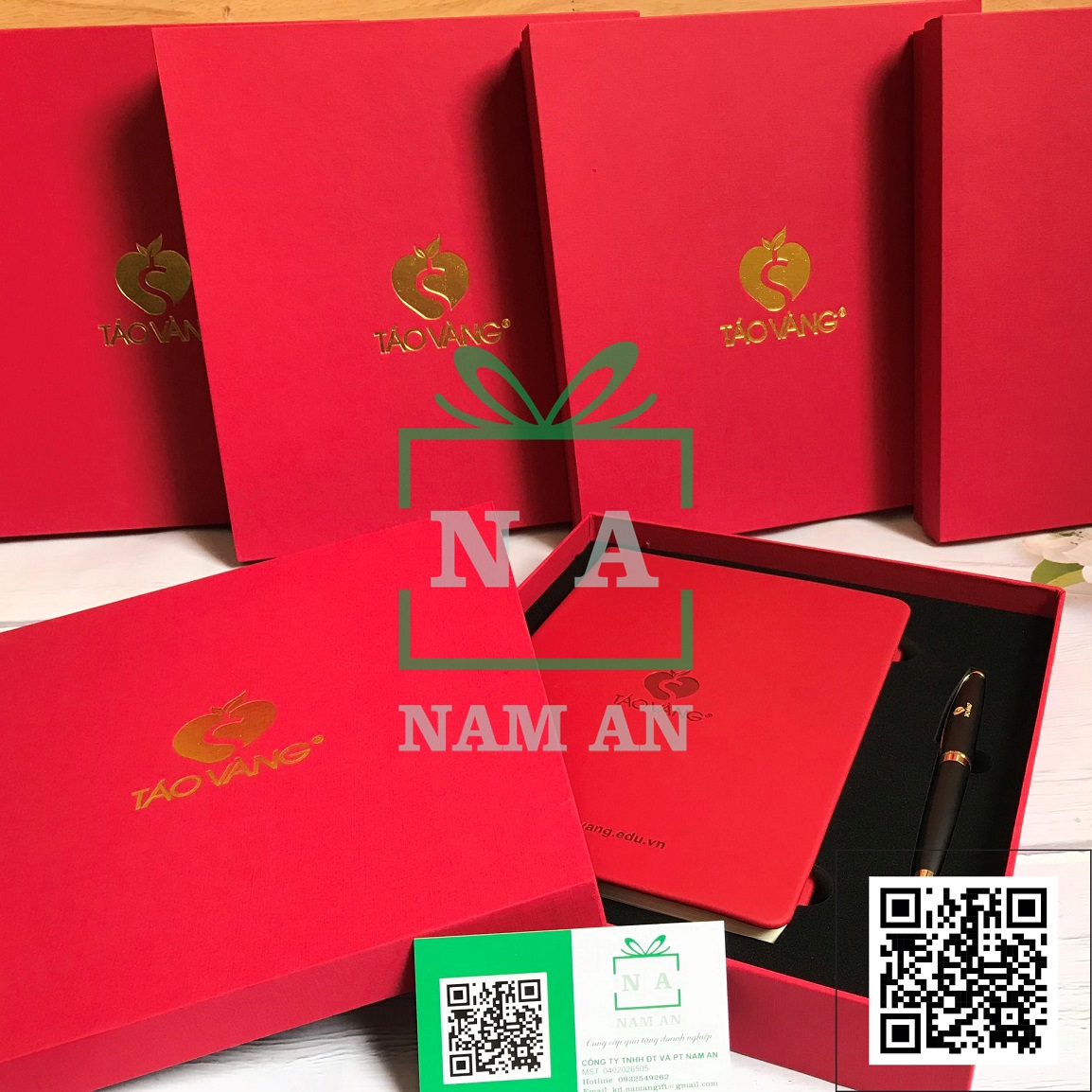 Sản xuất quà tặng khách hàng bộ quà sổ tay, bút kim loại in logo Táo Vàng.