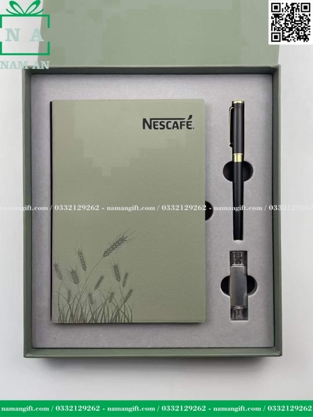 6. Bộ quà tặng 3 món gồm sổ da, bút kim loại và USB của khách hàng Nest Cafe